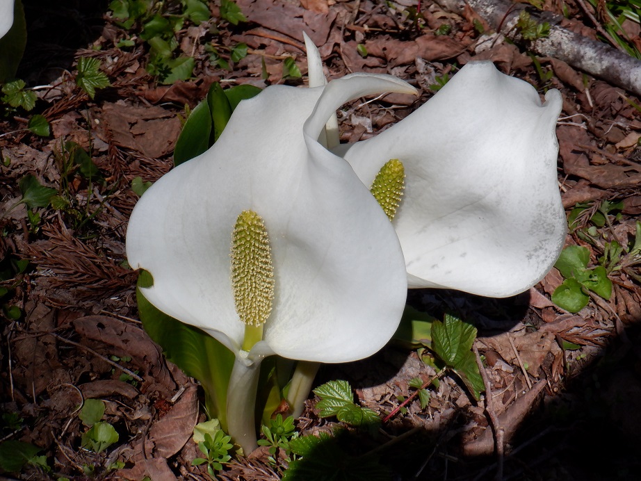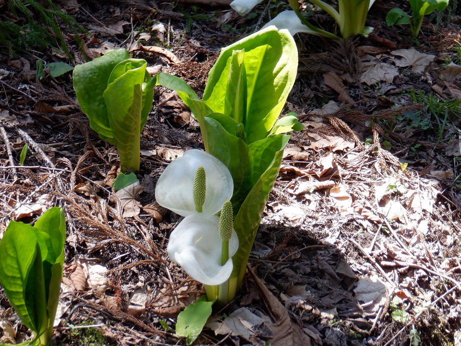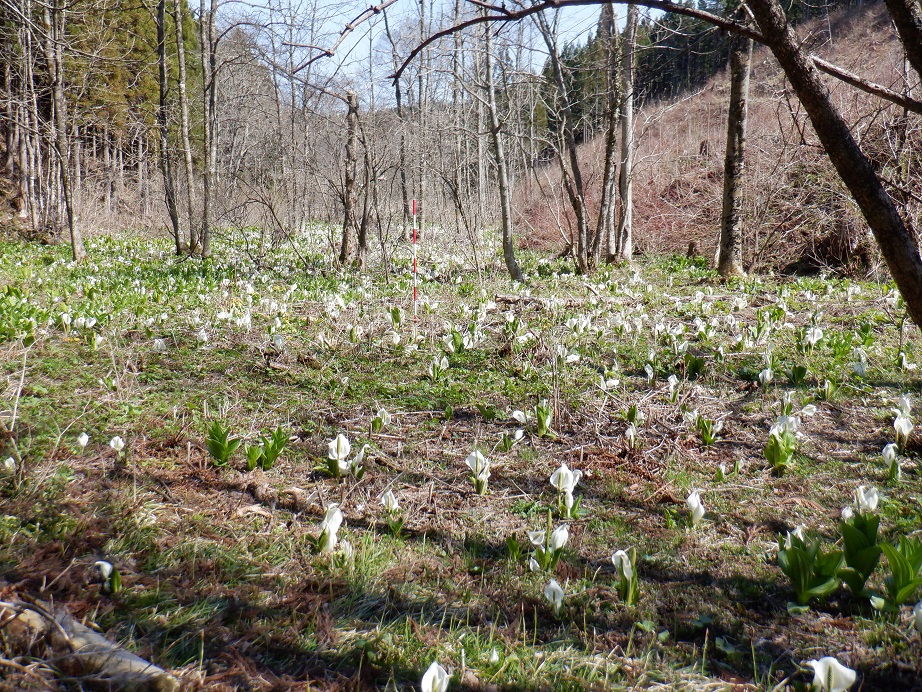 『水芭蕉の花盛りだ!』(2021/4/12) ※クリックで拡大します↓↓↓ 七福神の森の水芭蕉はピークの少し手前、7合目といった感じになりました。 一つの株から2~3本の花芽が噴出して、水芭蕉の花爛漫という状態です。 もう少し花が咲きそろえば、早くから咲き終わった株の葉が成長して 緑の葉と白の花のコントラストが見事になります。 来週あたりが見ごろかもしれません。 水芭蕉畑から目が離せない1~2週間になると思います。