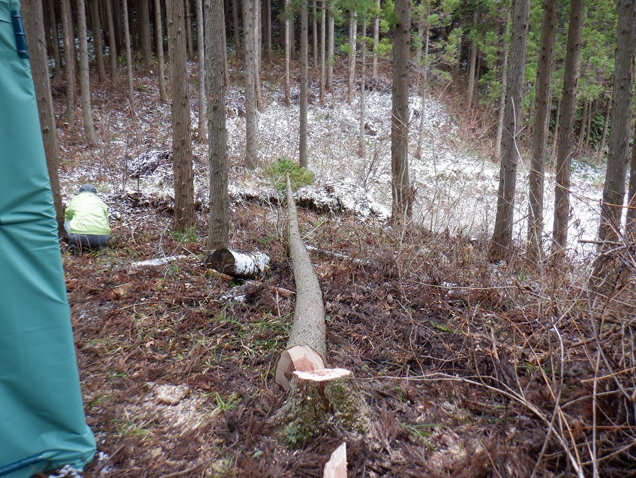 新しくなった水芭蕉畑近くの小屋の周辺を点検して、冬の降雪による樹木からの落雪の可能性を検討した結果、落雪の可能性がある杉の木が2本残っていました。