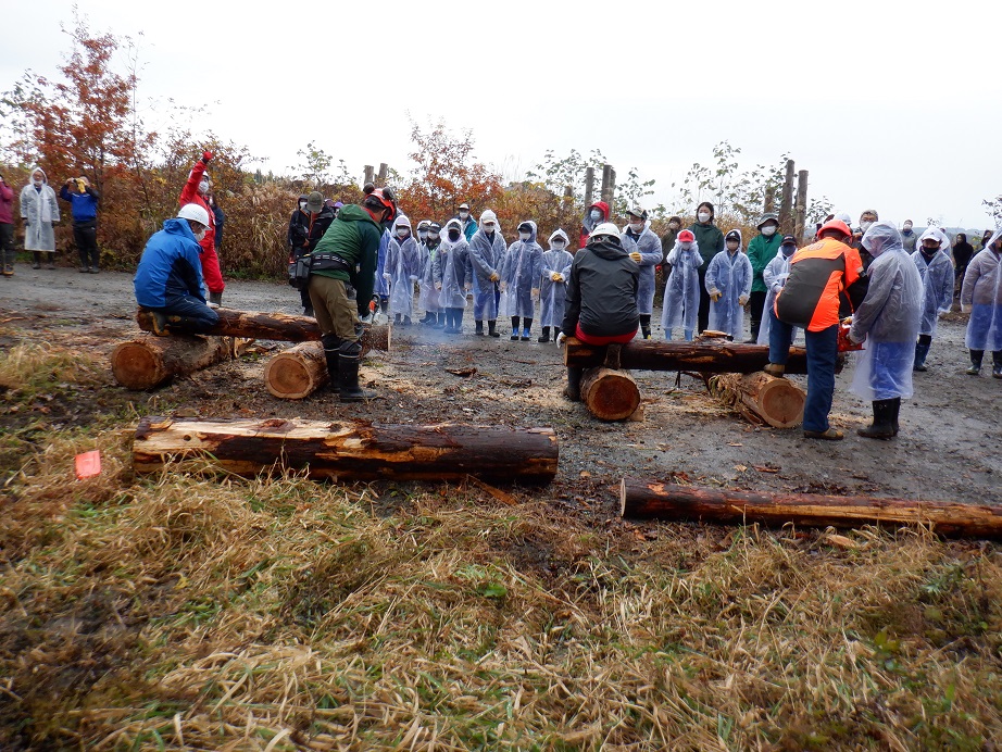 毎年秋に市内の小学生を招いて、青森ヒバと広葉樹の植林、丸太切体験などを行っています。